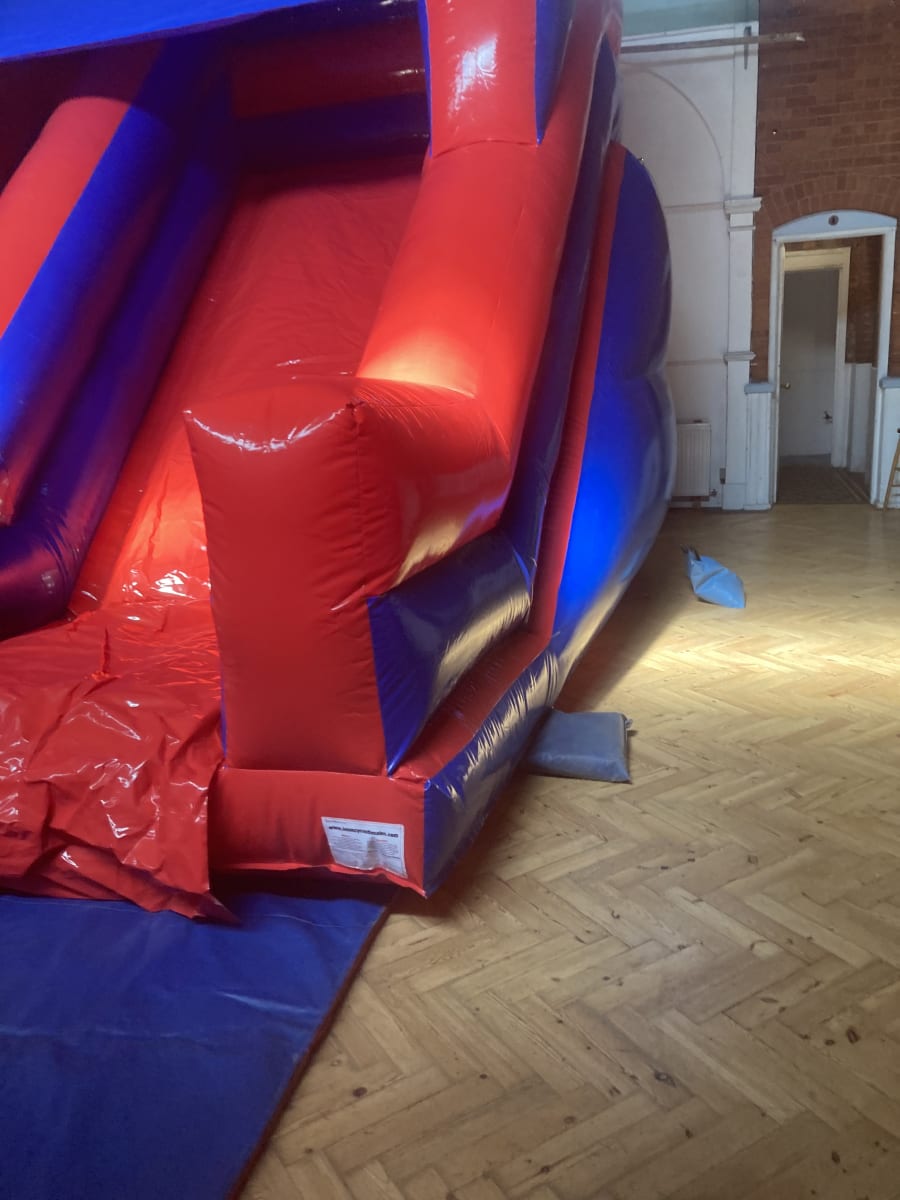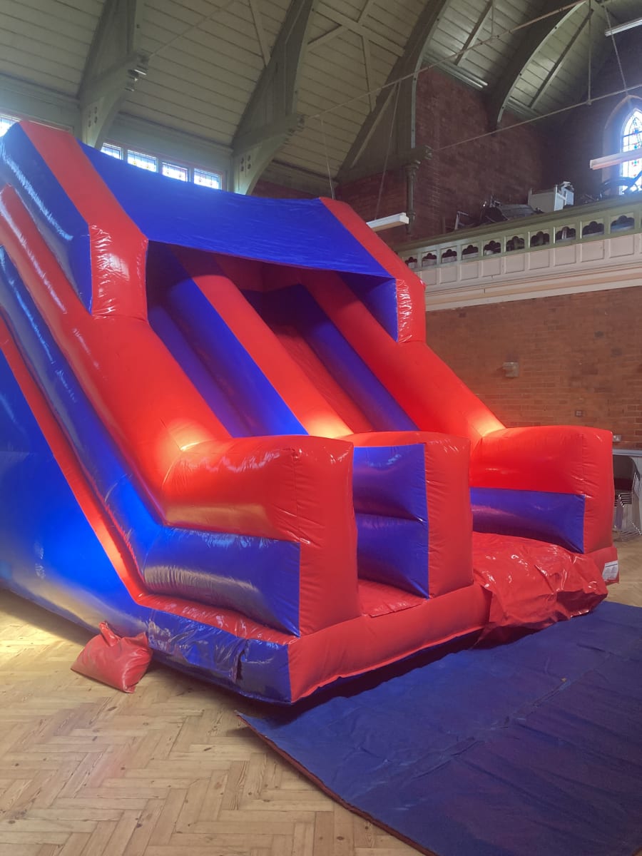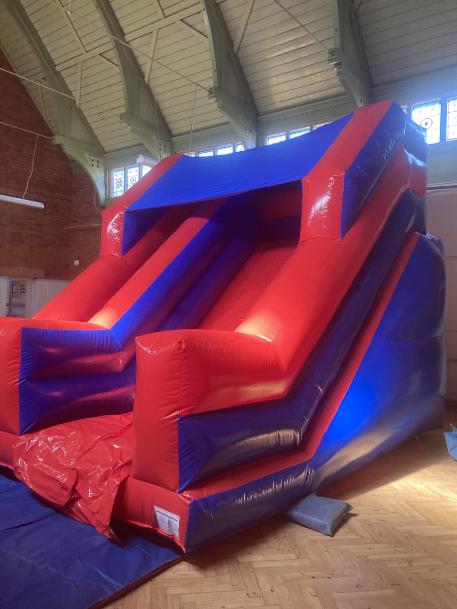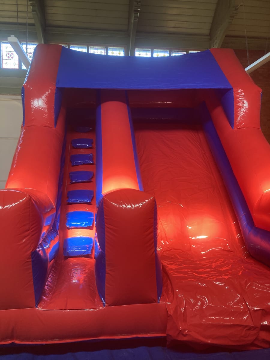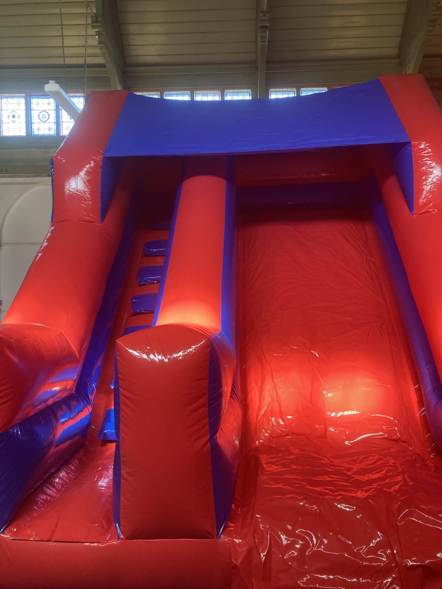Kingies Bouncy Castle Hire Croydon are pleased to offer for hire our new glossy red and blue 8ft platform inflatable slide, Built in roof to keep children safe before descending down the slide this is so much fun..