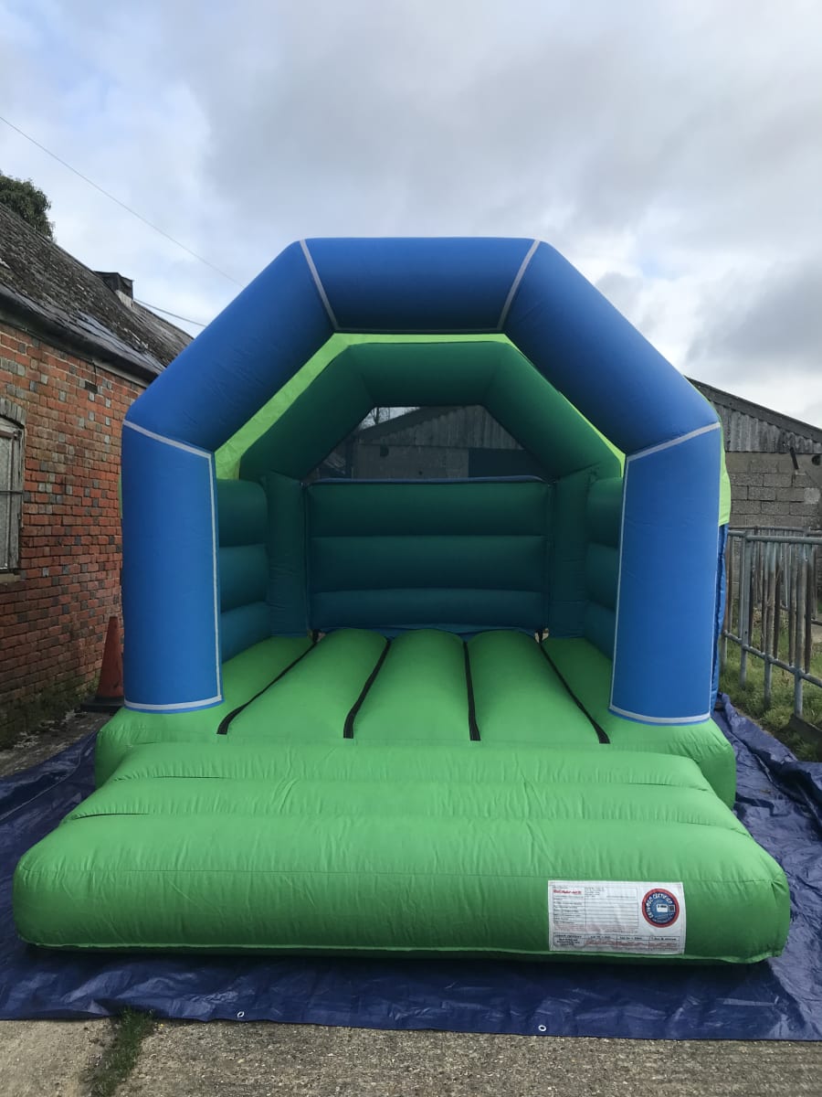 New plain Green and blue 11x15ft children's bouncy castle, this castle is suitable for indoor and outdoor use with built in , we have many different velcro theme panels that can be fitted to this castles , just ask for the theme you would like when booking