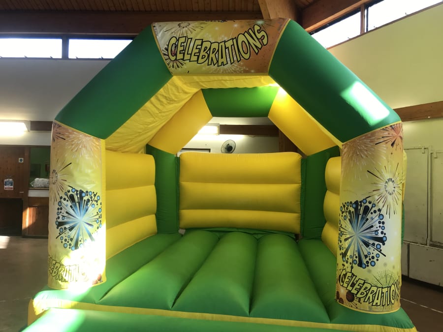 New Celebrations yellow 11x15ft children's bouncy castle, this castle is suitable for indoor and outdoor use with built in shower/rain cover we have many different colour castles to chose from in this theme