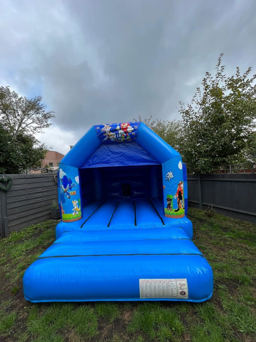 New Sonic glossy blue and light blue Velcro 11x15ft children's bouncy castle, this castle is suitable for indoor and outdoor use with built in rain cover ,