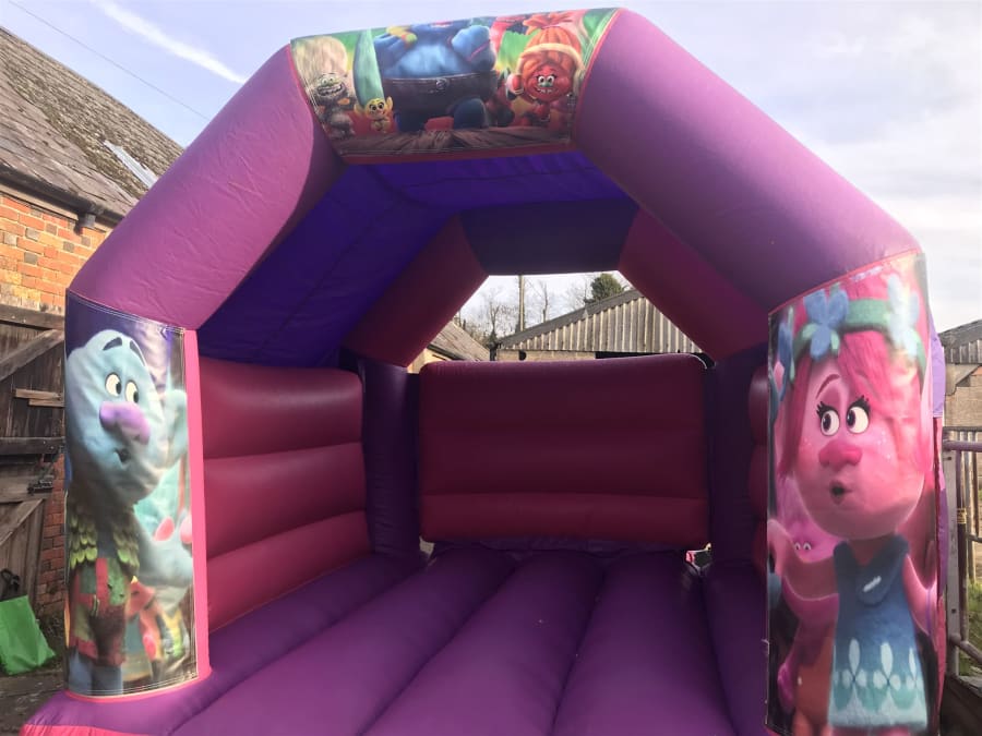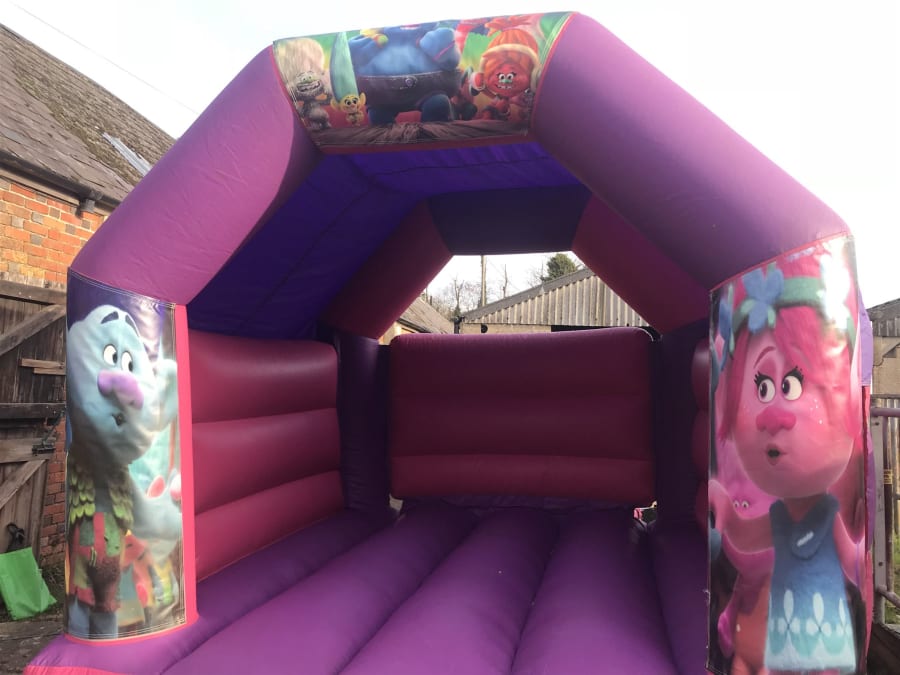 Trolls 11x15ft children's bouncy castle, this castle is suitable for indoor and outdoor use with built in shower/sun cover , this castle is suitable for children aged up to 10 years old this , great for children's party's and very popular for garden party's.