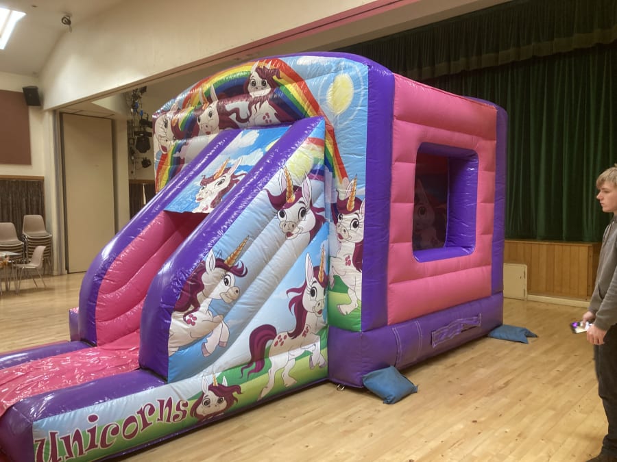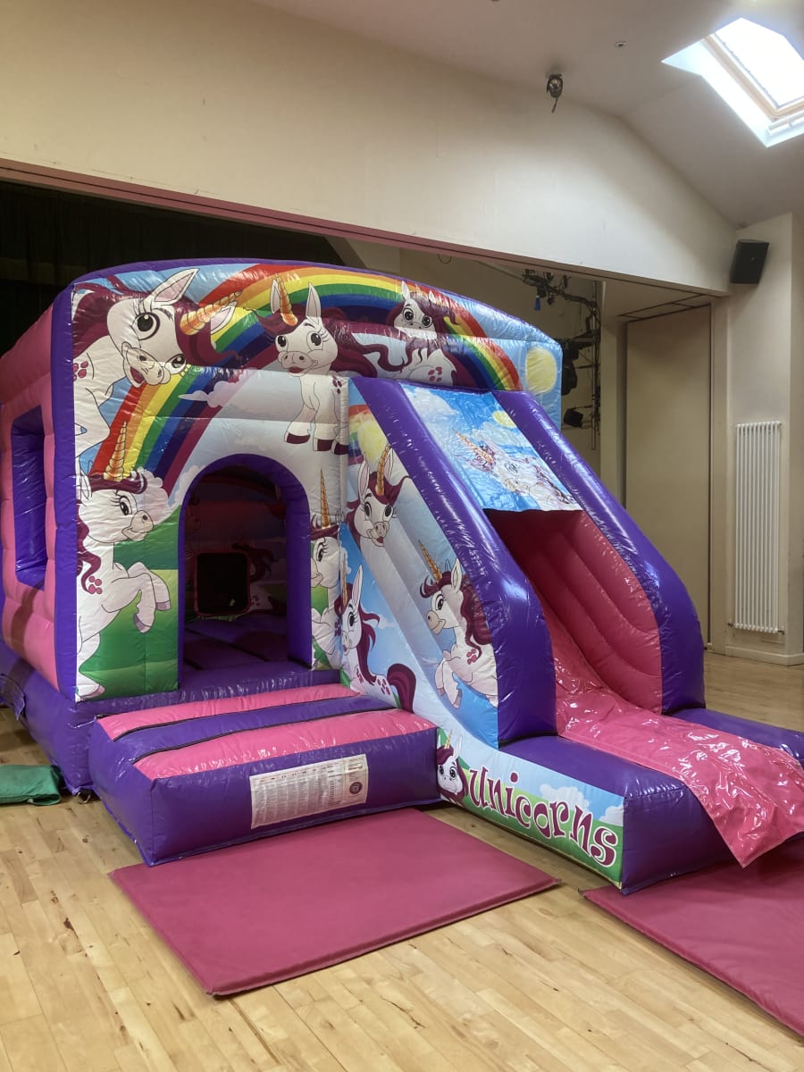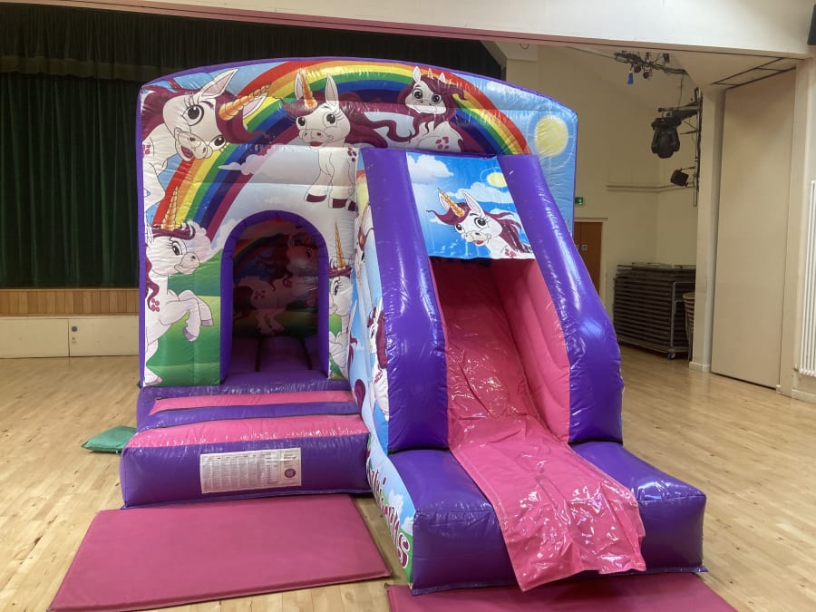 The new unicorns front slide castle is disco ready which means that you can have disco lights and a sound system included with this hire