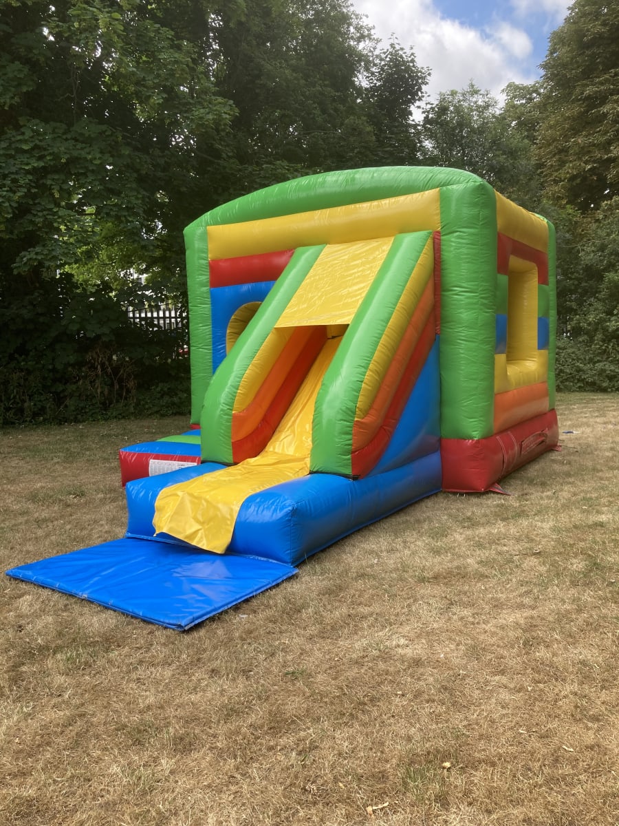 Our new 12x19 Rainbow Coloured Front Combo Slide Bouncy Castle , this castle is suitable for children and adults , and is ideal for indoor or outdoor hire. our 12x19 combo castle has a built in shower/sun cover which keep the bed of the castle cool on sunny days and dry in case of a light shower You'll be sure to love its vibrant appearance and its charming decor - kids love it, and have a whale of a time bouncing around.